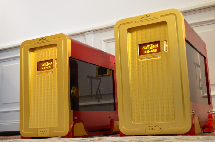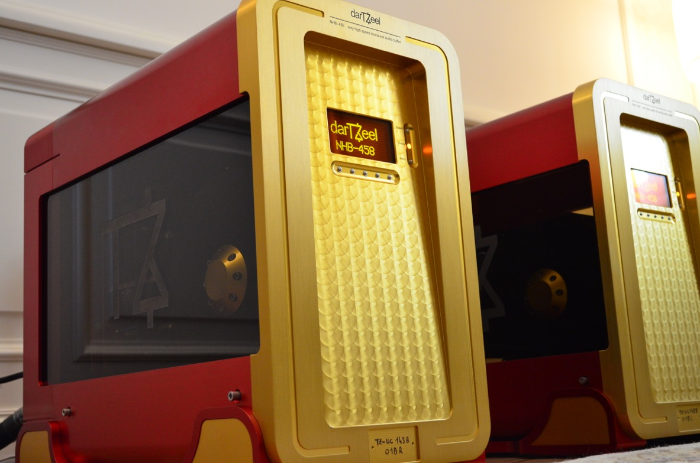 -Grazie al completo e costante controllo di ogni parametro, il software interno dell’NHB-458 è in grado di prevenire ogni possibile inconveniente, semplicemente interrompendo l’alimentazione principale prima che le bobine degli altoparlanti si scaldino pericolosamente; in ogni caso, nessuna limitazione è presente nella circuitazione audio come tale, ogni funzione di controllo essendo gestita dall’esterno, cosicché il massimo picco di corrente consentito è semplicemente enorme. * * * Viste le sue prestazioni di alto livello, la sua raffinatezza nel trattamento del segnale e la piacevolezza all’ascolto, il finale monofonico derTZeel NHB-458 non avrebbe potuto alloggiare se non in un sontuoso “contenitore”. Il pannello frontale è spesso 30 mm (il doppio rispetto all’NHB-108) e quello posteriore, che incorpora il dissipatore di calore, è di 85 mm. I trasformatori sono sostenuti in modo elastico nelle tre direzioni, con una massa sospesa complessiva di oltre 25 kg., accordati in frequenza in modo da assorbire ogni ronzio e vibrazione meccanica tra 40-70 Hz: una vera e propria sfida in termini di compattezza e di efficienza. I grossi piedi di appoggio, realizzati in alluminio, pesano più di 1 kg. ciascuno e sono disponibili punte aggiuntive per _coloro che preferiscono questo genere di supporto a terra. Le pareti laterali in vetro completano l’affascinante finitura dell’NHB-458 e riservano all’utente il piacere (e l’orgoglio) di poterne osservare (e mostrare) l’interno. L’assemblaggio ha la precisione di un orologio svizzero. Il darTZeel NHB-458 è, a tutti gli effetti ed in ogni suo più piccolo particolare, un eccellente prodotto di alta ingegneria. Basti pensare che il tempo richiesto per la sola lavorazione delle parti in alluminio, con gli straordinari risultati desiderati dal produttore, ammonta a più di 150 ore! Solo i fortunati possessori di questo straordinario finale potranno realmente avvertire, sperimentare, comprendere e, soprattutto, godere nel tempo, le inesprimibili emozioni, largite a piene mani dalle prestazioni sonore dell’NHB–458.