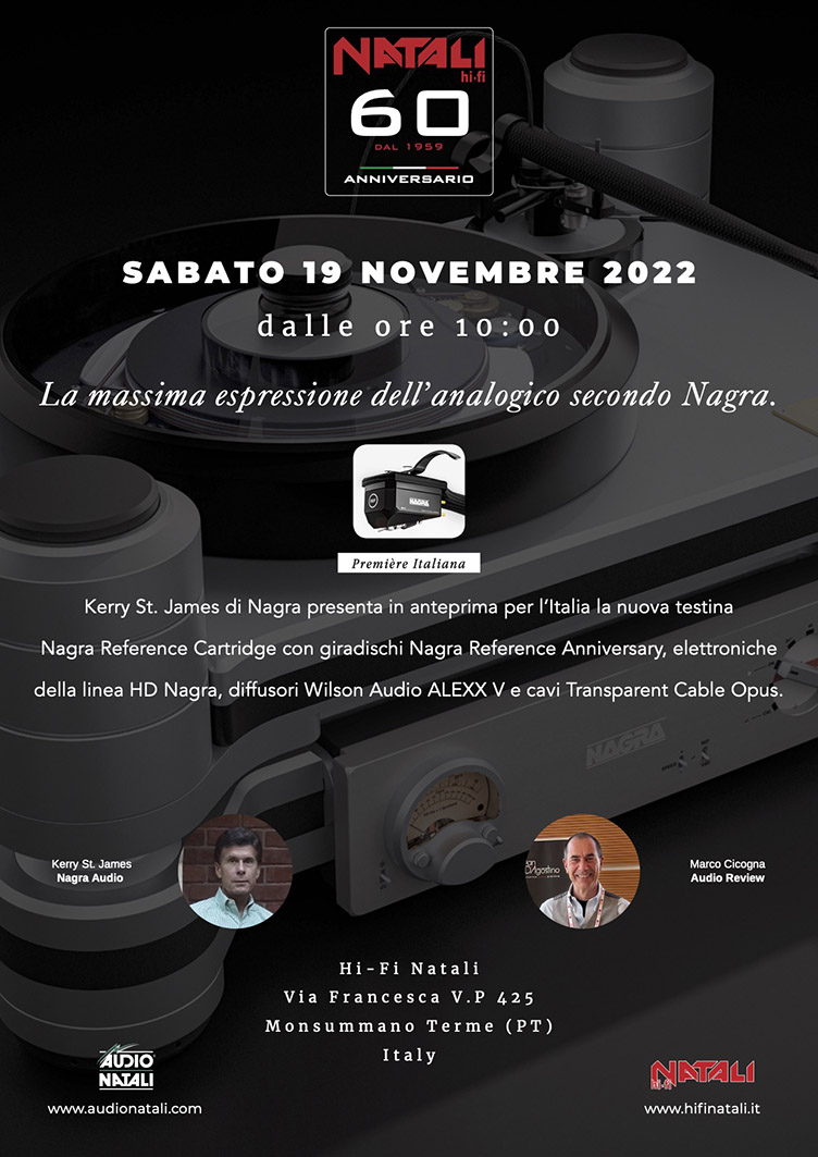 Audio Natali & HiFi Natali il giorno Sabato 19 novembre 2022 organizzano presso il punto vendita HiFi Natali a Monsummano Terme un evento dedicato all'analogico. Per l'occasione sarà presente Mr. Kerry St. James di Nagra che presenterà in anteprima per l'Italia la nuova testina Nagra Reference Cartridge con giradischi Nagra Reference Anniversary, elettroniche della linea HD Nagra, diffusori Wilson Audio ALEXX V e cavi Transparent Cable Opus.