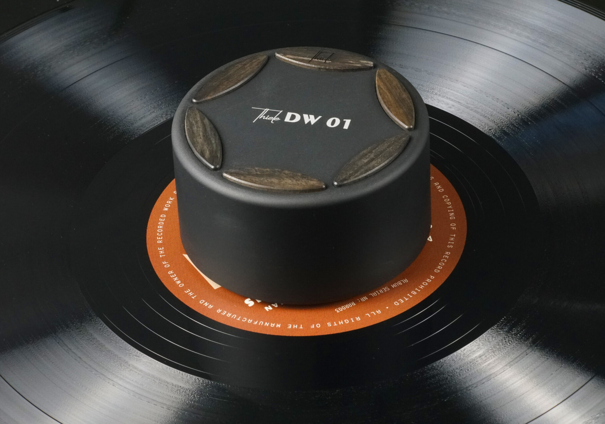 Quando un LP viene riprodotto, l’intero disco in vinile, incluse le etichette di carta (1), viene posto in vibrazione dal diamante e dalla puntina (2) della testina. Queste vibrazioni e risonanze si sovrappongono al segnale musicale, producendo un suono impreciso che compromette la riproduzione fedele e la precisa localizzazione degli strumenti musicali nello spazio virtuale. Lo stabilizzatore fa contatto con il disco in corrispondenza della parte superiore dell’etichetta di carta tramite tre astine in ebano (3) e trasmette le risonanze a un disco di accoppiamento scanalato (4) situato al centro del peso smorzante. Questo disco è collegato al corpo del peso tramite un gel smorzante (5). L’intero corpo (6) del peso, di circa 400 grammi, genera la pressione corrispondente sul vinile e smorza tutte le risonanze tramite il gel. Il corpo stesso del peso viene ulteriormente smorzato da inserti in ebano (7) posti in alto. Il risultato di tutte queste misure è un’efficace silenziamento del disco in vinile, con un’immagine sonora pulita e una localizzazione e riproduzione degli strumenti musicali molto precisa