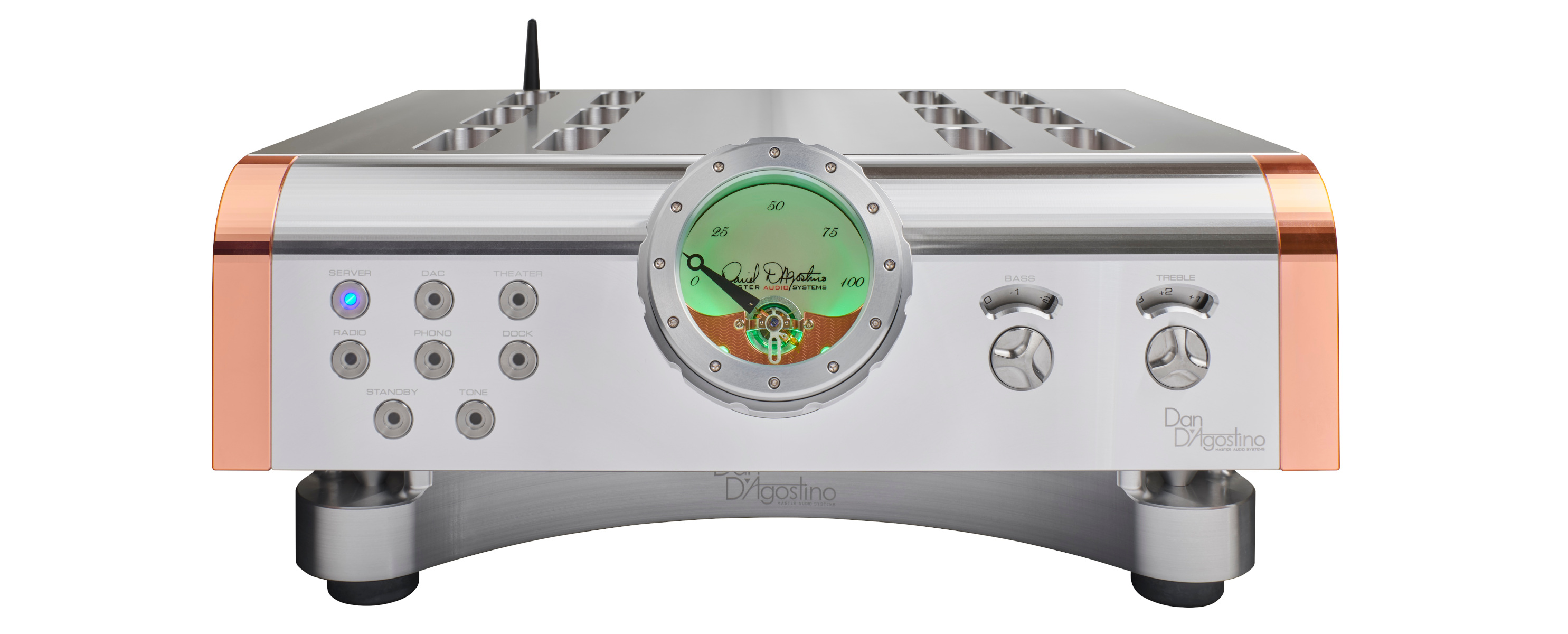 Molti appassionati hanno potuto apprezzare in questi mesi le notevoli prestazione musicali dei finali monofonici “Momentum” accoppiati di volta in volta con i migliori preamplificatori disponibili. Tuttavia e migliori sinergie sono quelle ottenibili proprio con l’abbinamento con il nuovo preamplificatore Momentum “Super Analog”, a dimostrazione di come gli accoppiamenti realizzati dalla mano di un progettista del calibro di Dan D’Agostino completano, esaltandole e collocandosi su un più elevato standard d’eccellenza, le prestazioni dei singoli componenti. Le doti musicali esibite negli ascolti già effettuati in alcuni importanti eventi High-End si sono fatte apprezzare da audiofili ed operatori del settore. Così come per gli amplificatori (le due versioni mono e stereo) anche il pre impiega una circuitazione totalmente bilanciata per la massima larghezza di banda e un elevato rapporto segnale/rumore. Il circuito audio è completamente discreto, senza amplificatori operazionali, con l’assenza di controreazione a realizzare un suono di alta qualità e fine introspezione. La regolazione del volume avviene per il tramite di una serie di resistenze controllate da un sistema ottico, il metodo attualmente più sicuro per evitare la contaminazione del segnale. Un telaio separato ospita l’alimentatore da 300 VA in modo da isolare i componenti del preamplificatore da rumori ed interferenze elettromagnetiche. I circuiti di controllo beneficiano di sezioni separate di alimentazione in modo che gli stadi di controllo risultino completamente isolati dai circuiti audio. La veste estetica del pre è perfettamente complementare a quella delle altre elettroniche della serie Momentum, con le rifiniture in rame che richiamano le analoghe ed originali fiancate dissipatrici del finale. Il raffinato VU meter sul pannello frontale, diventato ormai marchio distintivo della serie Momentum, indica il livello di impostazione del volume, mentre un anello attorno allo stesso meter controlla il volume. I pulsanti frontali di selezione si illuminano per mostrare quale ingresso è attivo. E’ compreso nella dotazione un telecomando a radio-frequenza, che consente di gestire il pre anche attraverso ostacoli come mobilio o muratura.